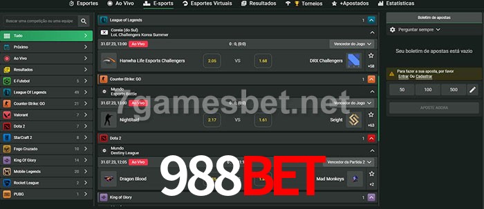 O 988Bet oferece uma grande seleção de opções de apostas em e-sports com probabilidades competitivas